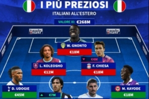 前锋:科莱奥肖(伯恩利,1200万欧)、尼翁托(利兹联,1800万欧)、基耶萨(利物浦,1800万欧)